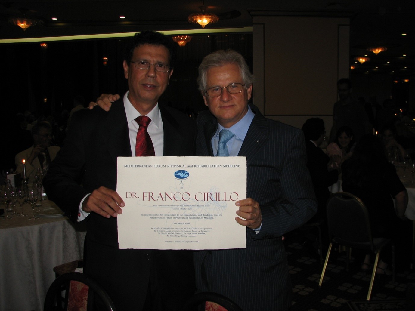 The 7th Mediterranean Congress of PRM (Sept.18-21, 2008) in PORTOROSE of Slovenia, was a great success of both the scientific and social events. The president of the congress, Pr. Crt Marincek, the supporting president of the Slovenian Society of PRM was Dr Klemen Grabljevec and the Board members of the Slovenian Society have done their best to organize everything in a warm Mediterranean environment and we all lived unforgettable moments. During the Gala dinner we had the opportunity to honour the late Prof. Haim Ring and to honour Dr Franco Cirillo by giving him the first “MFPRM AWARD” for his contribution to the Forum members by operating the Euro-Mediterranean PRM School in Syracuse for four continuous years till now.